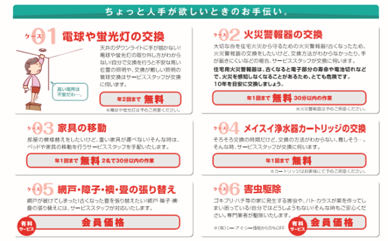 そのほかには、電球の交換や家具の移動なども無料で対応してもらえますし、パソコンの設定などももありますので住まい全般のサービスが受けられる内容になっています。