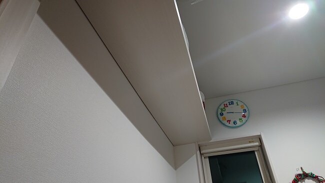 ちなみにこれは、ブログ用に設置してみただけなので、すぐに取り外しますが、ゆくゆく荷物が増えたり高いところに保管しておく必要があるものがあった場合には、こんな感じで棚板として設置する予定です。