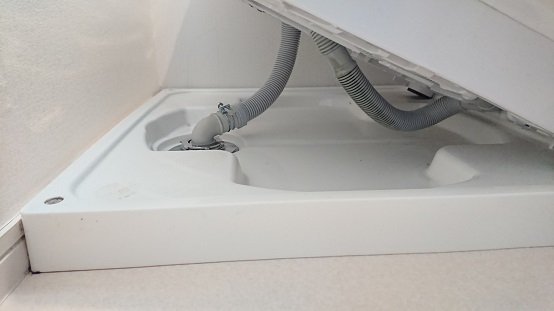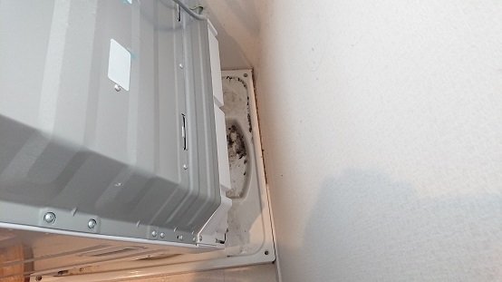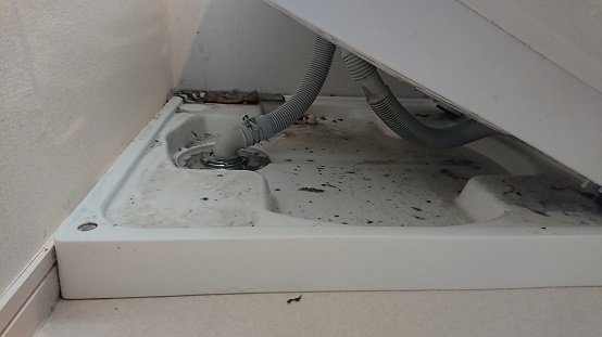 子供の水遊びの仕業かなとも思っていたのですが、様子が違い洗濯乾燥機のあたりが異様なまでに濡れていて黒くなったホコリの塊もありましたので、これは洗濯排水が漏れているなだなと思いました。