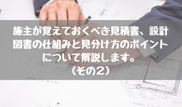 前回に引き続きその2として施主が覚えておくべき見積書、設計図書の仕組みと見分け方のポイントについて解説します。